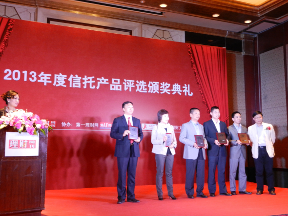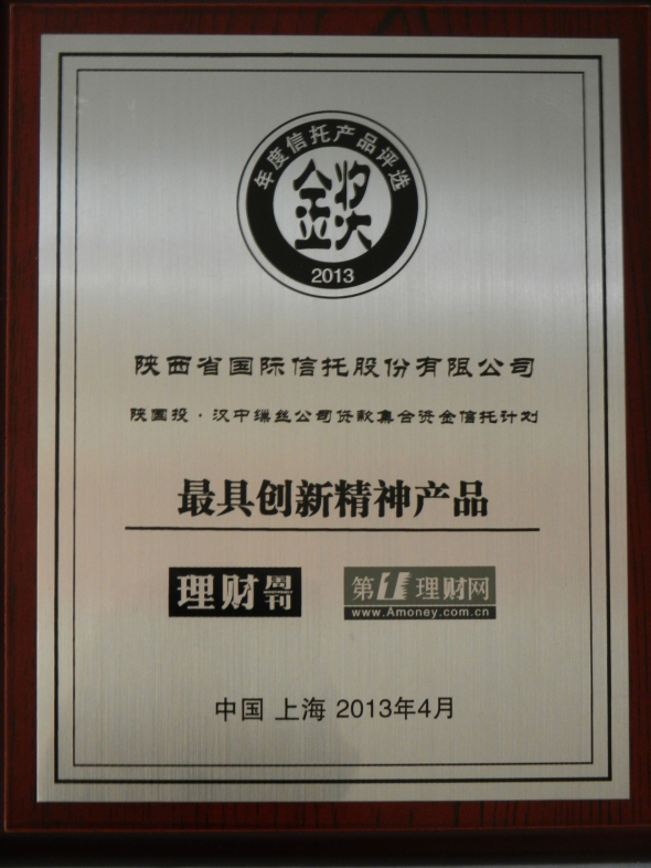 由国内权威理财媒体《理财周刊》、《第一理财网》主办的“2013年度信托产品评选颁奖典礼暨2012年度理财产品分析报告”最近在上海隆重举行。我公司发行的“汉中缫丝公司集合资金信托计划”作为创造性的扶持当地农业小微企业的典型代表,在此次“2013年度信托产品评选”活动中荣获“最具创新精神产品金奖”。