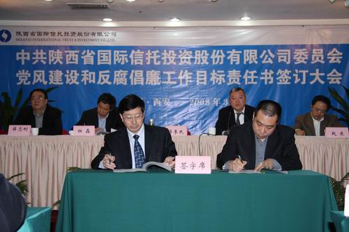 2008年3月31日,我公司在神州高速酒店唐厅召开了党风建设和反腐倡廉目标责任书签订大会。公司党委副书记、纪委书记黎惠民主持会议,并宣读了《中共陕西省国际信托投资股份有限公司委员会2008年度党风建设和反腐倡廉工作要点》;公司党委书记、董事长薛季民同志分别与各部门(单位)负责人签订《部门(单位)党风建设和反腐倡廉工作目标责任书》。会议要求各部门(单位)会后开展一次廉洁从业教育,并组织员工认真签署《员工廉洁从业承诺书》。