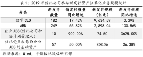 信托公司参与的存量资产证券化业务方面,截至2019年底,信贷CLO存量规模达到1.44万亿,同比增长31%;ABN存量规模达到3729.24亿元,同比增长120%;以信托受益权作为基础资产的企业ABS存量规模达到1647.17亿元,同比增长18.99%。