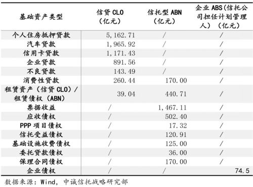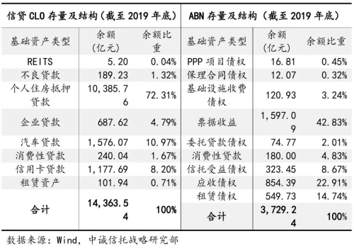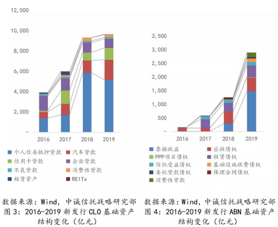 信托参与的存量资产证券化业务中,基础资产结构与新发行情况相似。根据2019年底的存量数据,存量信贷CLO中,个人房贷、车贷、信用卡贷占比居于前三,个人房贷占比超过七成,三类基础资产合计占比超过九成;存量ABN中,票据收益、应收债权、租赁债权占比居于前三,三类基础资产合计占比超过八成。