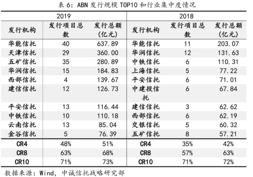 三是银行系和央企系信托公司资产证券化业务展业突出。信贷CLO方面,2019年,建信信托、华润信托、华能信托新发行规模位居前三,其中华能信托从2018年的不足百亿猛增到2019年的过千亿。ABN方面,2019年,华能信托、天津信托、五矿信托新发行规模位居前三,天津信托、云南信托、金谷信托较上年新进前十。