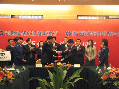 2007年2月12日下午,我公司与中国建设银行股份有限公司陕西省分行在喜来登大酒店签署了《全面合作协议书》,拉开了两家单位在21个方面进行全面合作的帷幕。公司党委书记、董事长薛季民、党委副书记兼纪委书记黎惠民、副总裁何熙平、副总裁赵辉、总会计师李玲及信托部门有关人员等参加了签字仪式。建设银行陕西省分行行长曾益、副行长魏承国,省分行机构业务部总经理于卉、省分行个人金融业务部总经理杨利民等出席签字仪式。薛季民董事长、曾益行长先后发表了热情洋溢的讲话,共同祝愿双方取得实质性合作,实现双赢。