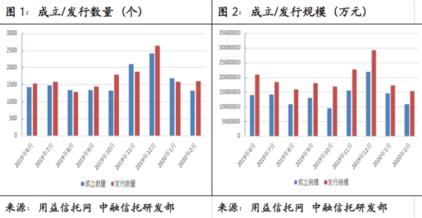 根据用益信托公布的数据来看,受疫情影响,2月集合信托市场发行和成立市场延续了1月的下滑势头,但尚处于市场预期之内。