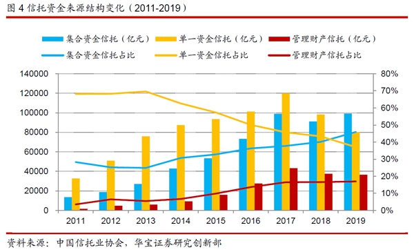 与此同时,为适应监管政策变化,信托公司业务开展逐步转型,普遍加强财富渠道建设,增强主动管理能力,集合资金信托占比稳定上升。2019年末,存量集合资金信托规模9.92万亿,规模较年初增加8121亿元,规模占比由年初的40.12%提升到45.93%。