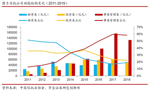 业务结构:信托业务结构不断优化。从信托资产的资金来源和功能结构两个方面来看看,“资管新规”落地后,通道与多层嵌套业务不断清理与压缩,信托公司主动管理能力增强,信托业务结构持续优化。
