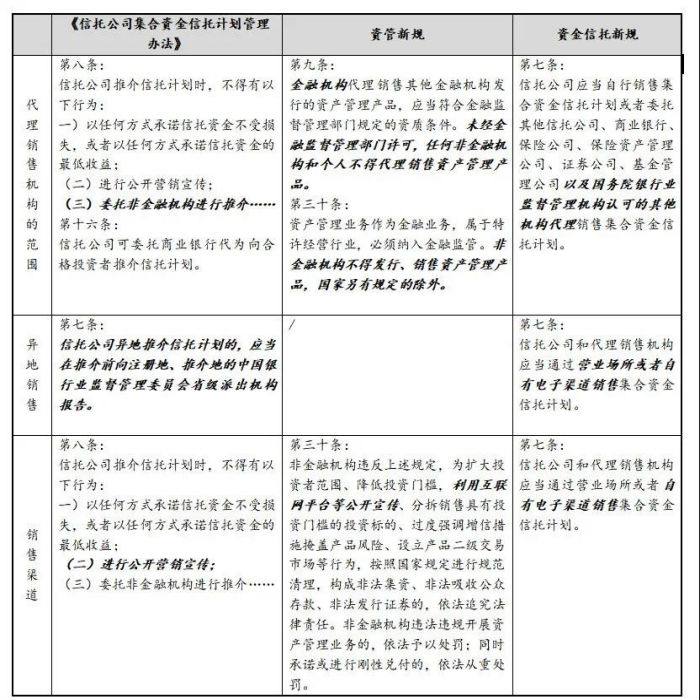 资金信托新规相对于资管新规及《信托公司集合资金信托计划管理办法》等规定,除再次强调“卖者尽责,买者自负”,禁止刚兑的原则外,在资金信托推介及销售上,主要有以下几个方面的变化:1、留出委托非金融机构推介的空间;2、未要求异地销售事先报告;3、允许电子销售渠道。