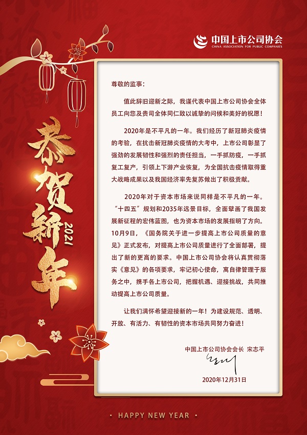 公司为中国上市公司协会监事单位,为感谢我公司2020年以来对协会工作的大力支持,宋志平会长特向我公司发来了《新年贺信》。