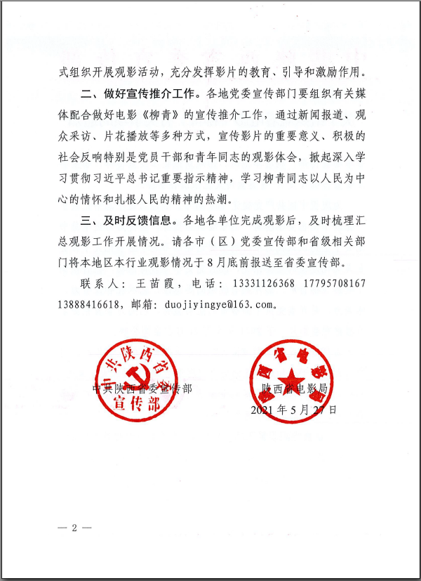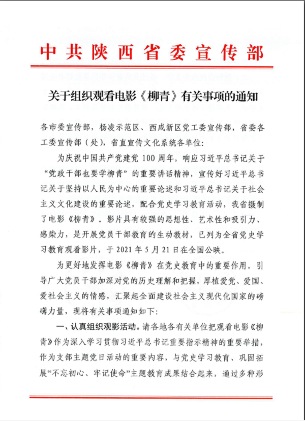 中共陕西省委宣传部关于组织观看电影《柳青》有关事项的通知