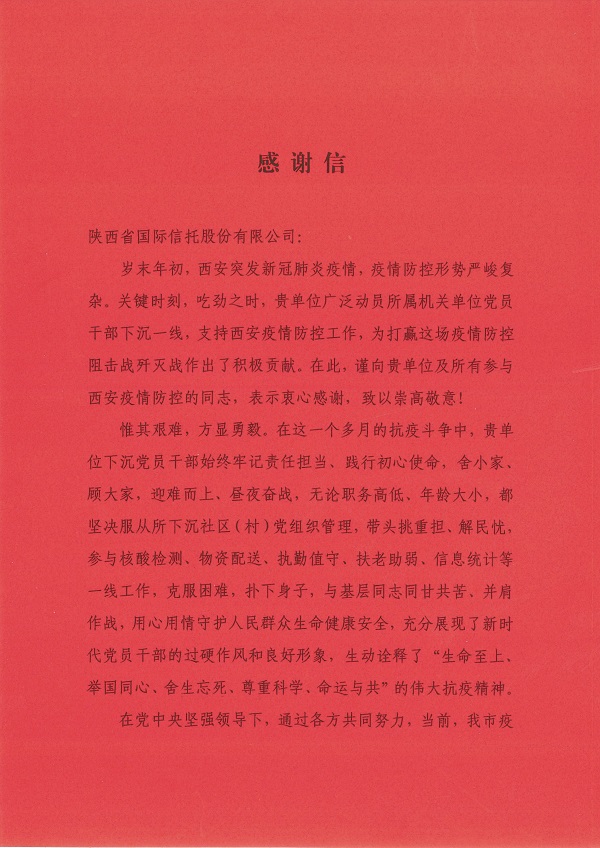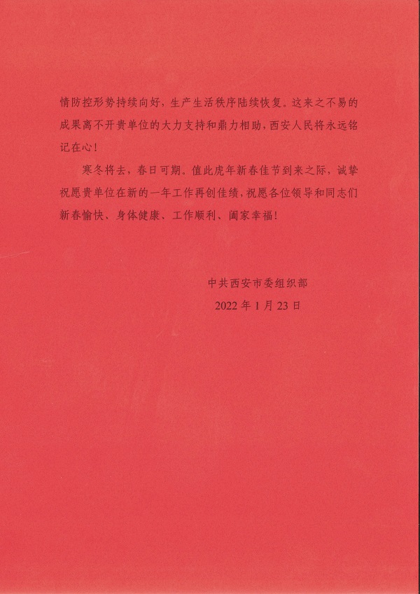 公司收到中共西安市委组织部发来的感谢信