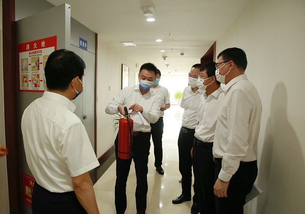 姚卫东一行逐个检查了公司办公场所、员工餐厅、公共区域的消防设施、安全保卫、防恐防暴、地下车库消防和防汛设施,以及公司电气管理、机房和网络安全管理、疫情防控等情况,全面了解公司安保配备、值班备勤、应急处突等工作开展情况,详细排查风险隐患。